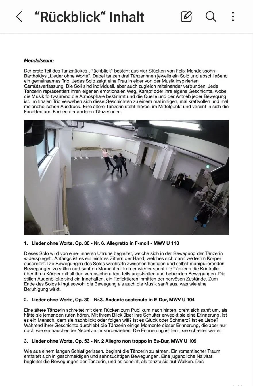 木村:コロナ禍だったので、リモートで振付ける必要があり、以前から友人のアンドレアスに声を掛けました。楽曲が先にあったのですが、私たちトリオのパフォーマンスを見てトリル( 楽器)を入れたり、編曲したり、演奏し直してくれたりしました。2 年前の2 月にzoom でクリエイションが始まりました。ソロはできるけどトリオはzoom では無理なので、コロナが終わり直接振り付けてもらいました。Kissinger Sommer は今まで音楽だけだったのですが、40 周年記念に、初めてアンドレアスが踊りを持っていく事になりました。やはりドイツの作曲家の物がやりたいと言うことで、「Mendelssohn」を持って行こうとなりました。